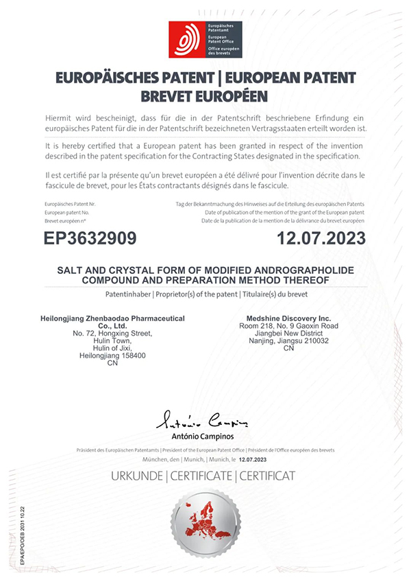 8月15日,珍寶島藥業(yè)發(fā)布公告。公司收到歐洲專利局頒發(fā)的內(nèi)容為《一種穿心蓮內(nèi)酯改構(gòu)化合物的鹽型、晶型及其制備方法》的專利授權(quán)證書。其國際專利申請(qǐng)?zhí)枮镻CT/CN2018/088168,專利權(quán)期限為申請(qǐng)之日起20年。